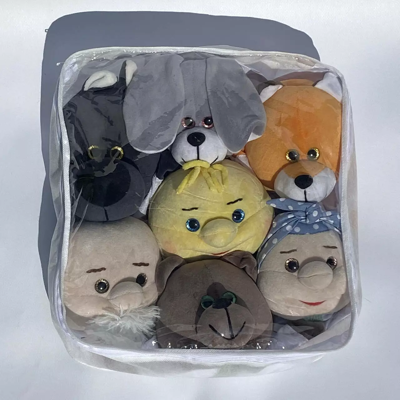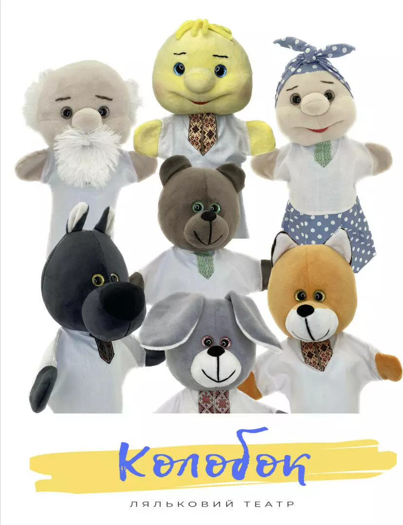 В набор входят куклы: дед, баба, колобок, лисичка, волк, зайчик и медведь. Каждая кукла выглядит ярко и удобно одевается на руку как взрослого так и ребенка, что позволит с легкостью управлять имитацией движений кукол.