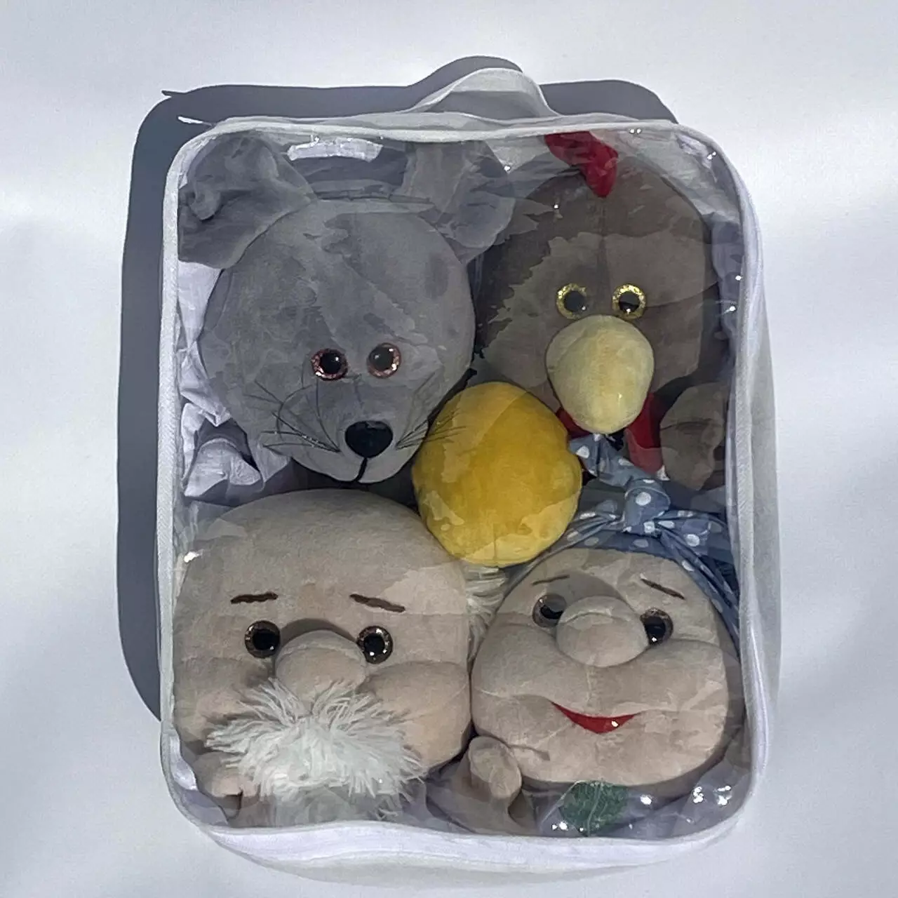 В набор входят куклы: дед, баба, курочка, мышка и яйцо. Каждая кукла выглядит ярко и удобно одевается на руку как взрослого так и ребенка, что позволит с легкостью управлять имитацией движений кукол.