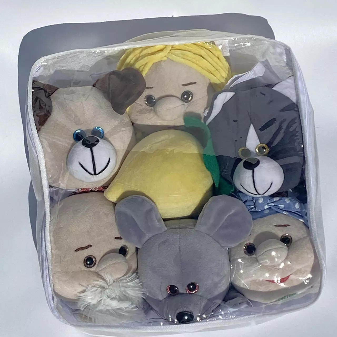 В набор входят куклы: дед, баба, внучка, репка, собачка, котик и мышка . Каждая кукла выглядит ярко и удобно одевается на руку как взрослого так и ребенка, что позволит с легкостью управлять имитацией движений кукол.